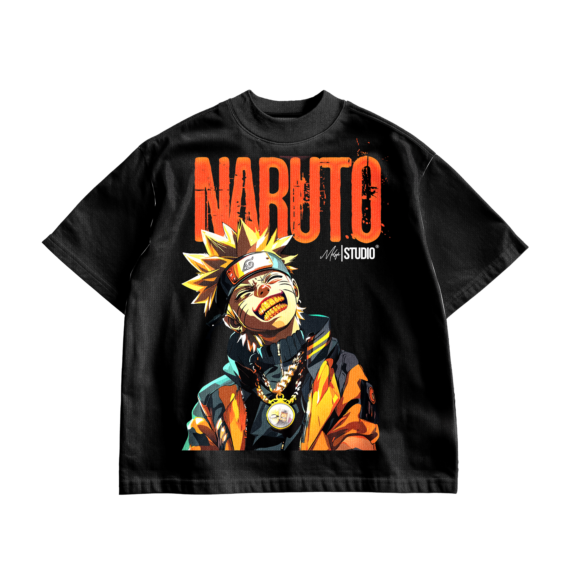 Embrace the spirit of resilience with the Naruto X Milyé Oversized Tee, a tribute to the journey of growth and determination. Inspired by Naruto, this shirt captures the essence of a character who transformed adversity into strength. The fierce graphic showcases Naruto's iconic features, complete with a gold grill and a chain that pays homage to his mentor, Master Jiraiya.